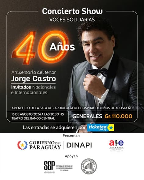 Un espectáculo musical de gran envergadura se prepara en Asunción para conmemorar cuatro décadas de trayectoria artística del reconocido tenor Jorge Castro. El concierto show “Voces Solidarias” no solo celebrará este hito en la carrera del artista, sino que también tendrá un propósito altruista, ya que lo recaudado será destinado íntegramente a la Sala de Cardiología del Hospital de Niños Acosta Ñu.