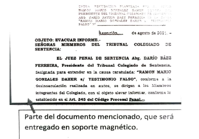 Tras la modificación de la carátula del expediente de la causa “Ramón Mario González Daher sobre Testimonio Falso” a “Arnaldo Joel Duré sobre Estafa” y la consecuente imputación de la entonces Actuaria del Juzgado de Sentencia 21, Abog. Juliana Romero Maciel, la defensa ha solicitado varias diligencias al Ministerio Público como acto investigativo a fin de precautelar elementos de prueba a ser evaluados durante el proceso.
