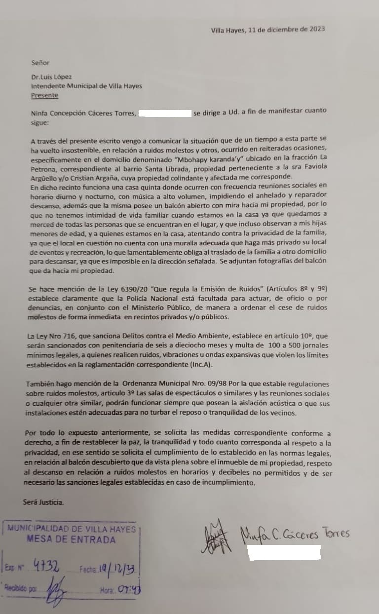 En fecha 11 de diciembre de 2023, Cáceres presentó una nota dirigida al Intendente de la Municipalidad de Villa Hayes, Luis López, informando sobre la insostenible situación para toda la familia debido a los insoportables niveles de ruido. En enero de 2024 el expediente pasó al Juzgado de Faltas y desde entonces todos los reclamos han sido deliberadamente ignorados por las autoridades competentes, ya que el Director de Obras, Oscar Darío Roussillón Núñez, sobrino de Bachi Núñez, es amigo y ex compañero de trabajo de la denunciada Faviola Argüello.
