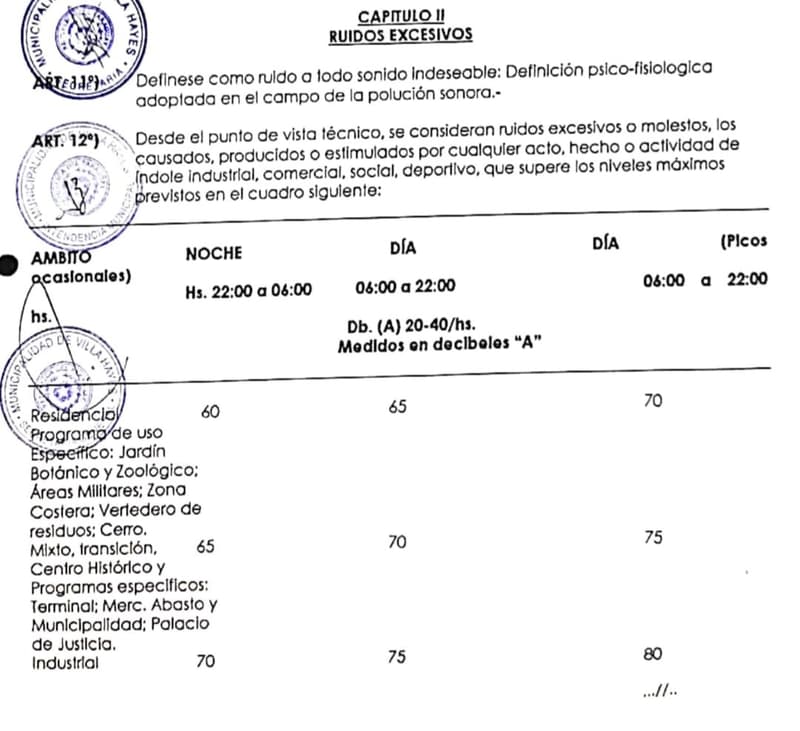 A pesar de que la Ordenanza Municipal 09/98 de la Municipalidad de Villa Hayes es clara con respecto a las regulaciones sobre ruidos molestos, disponiendo en su Artículo 1: “Prohíbese dentro de los límites de la ciudad de Villa Hayes en ambientes públicos o privados, producir, causar o estimular ruidos o vibraciones molestas, sea cual fuere el origen, cuando, por razón de la hora, del lugar que proceden afecten la tranquilidad de o reposo de la población o bienes materiales de terceros” y teniendo en cuenta las pruebas presentadas por Ninfa Cáceres al Juzgado de Faltas, el Director de Obras emitió el dictamen afirmando que la obra no infringe norma alguna.