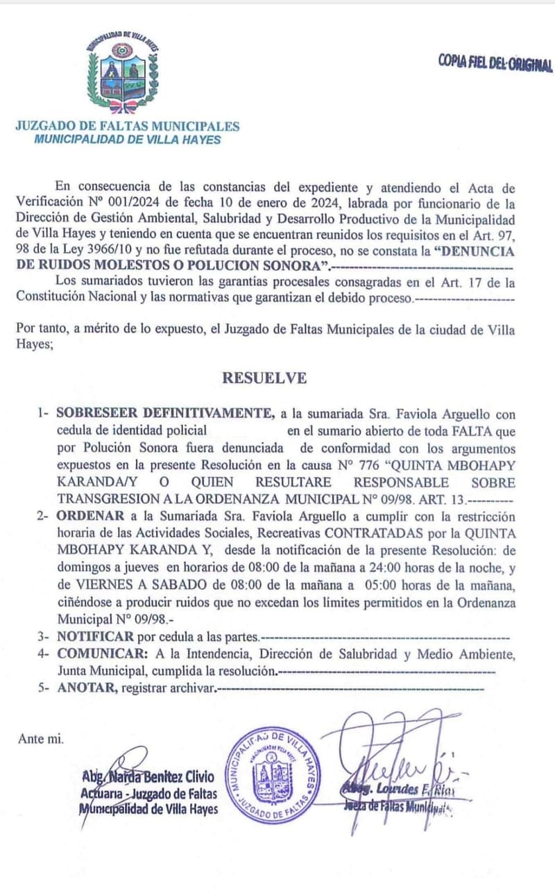 El 5 de agosto de 2024, el Juzgado de Faltas emitió la SD Nº 089/2024 por la cual resolvió sobreseer definitivamente a la Sra. Faviola Argüello de toda falta que por polución sonora fuera denunciada en la cause Nº 776/ “Quinta Mbohapy Karanday o quien resultare responsable sobre transgresión a la ordenanza municipal Nº 09/98. Art. 13”.