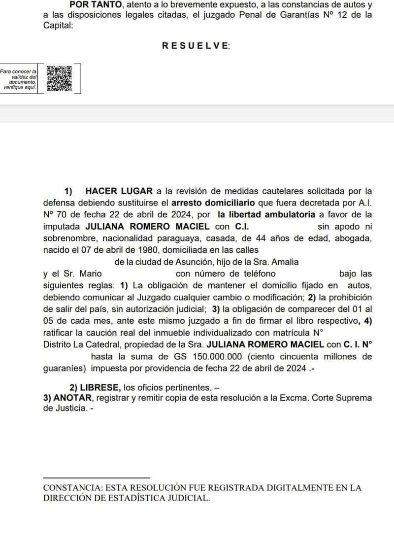 La vulneración del sistema JUDISOFT que causara la modificación de la carátula del expediente de la causa “Ramón Mario González Daher sobre Testimonio Falso” a “Arnaldo Joel Duré sobre Estafa” derivó en la imputación de la entonces Actuaria del Juzgado de Sentencia 21, Abog. Juliana Romero Maciel, quien después de cuatro meses de prisión domiciliaria, obtuvo libertad ambulatoria luego de que su abogado, José Marcet Testa, solicitara la revisión de la medida cautelar de arresto domiciliario que pesaba en su contra.