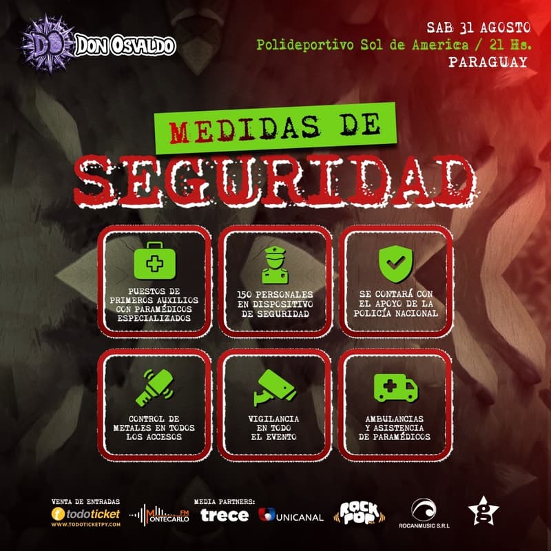 La organización del evento dispuso medidas de seguridad exhaustivas para garantizar una experiencia placentera y segura para todos los asistentes. Estas incluyen puestos de primeros auxilios, un amplio dispositivo de seguridad y control de accesos, asegurando así que el foco esté en disfrutar de la música y la energía del show.