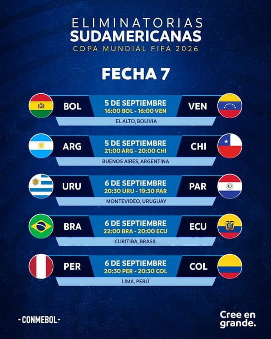 La séptima fecha de las Eliminatorias Sudamericanas rumbo al Mundial 2026 se disputará esta semana, con partidos que comenzarán el jueves 5 de setiembre y finalizarán el viernes 6. El combo incluye enfrentamientos clave para las selecciones en su camino hacia la clasificación.