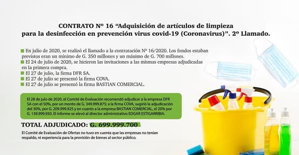 Diosnel Gustavo Benítez Centurión, uno de los auditores, declaró no haber encontrado irregularidades en la licitación N° 12/2020. Sin embargo, señaló que, en el caso del llamado N° 16/2020, que contemplaba la compra de artículos de limpieza, se utilizó el mismo análisis referencial que en la contratación N° 12. Según Benítez, esto no está contemplado en la Resolución DNCP 411/18, que exige un análisis independiente para cada proceso de compra.