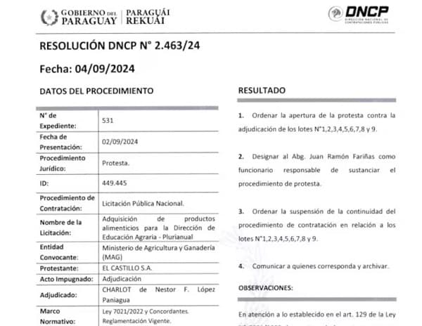 La Dirección Nacional de Contrataciones Públicas (DNCP) ha dispuesto la suspensión del llamado a licitación del Ministerio de Agricultura y Ganadería (MAG) para la provisión de alimentos a las escuelas agrícolas del país. La suspensión, establecida el pasado 5 de septiembre, responde a cuestionamientos sobre las ofertas presentadas por tres empresas, entre ellas Charlot Servicios Gastronómicos, ya investigada por irregularidades en otros contratos.