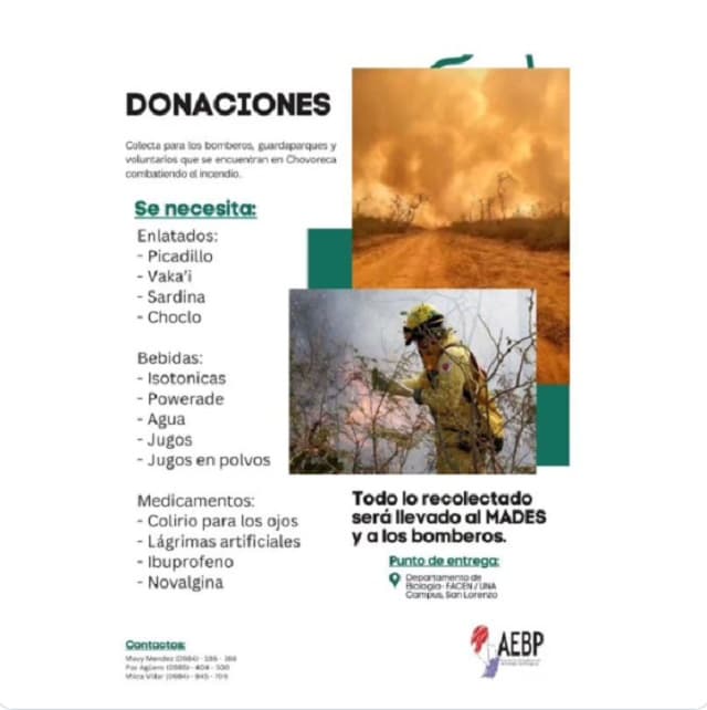 Los estudiantes de la carrera de Biología de la Facultad de Ciencias Exactas y Naturales (Facen) de la Universidad Nacional de Asunción (UNA) pusieron en marcha una colecta solidaria para apoyar a bomberos, guardaparques y voluntarios que se encuentran luchando contra los incendios forestales en el Chaco y otras zonas del país. La iniciativa busca recaudar alimentos, bebidas y medicamentos para quienes arriesgan sus vidas combatiendo el fuego.