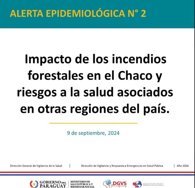 El Ministerio de Salud Pública y Bienestar Social declaró una alerta epidemiológica debido al deterioro de la calidad del aire causado por los incendios forestales en el Chaco, Bolivia y Brasil. La alerta busca reforzar las acciones de mitigación y garantizar una respuesta efectiva ante los riesgos para la salud pública generados por esta situación.