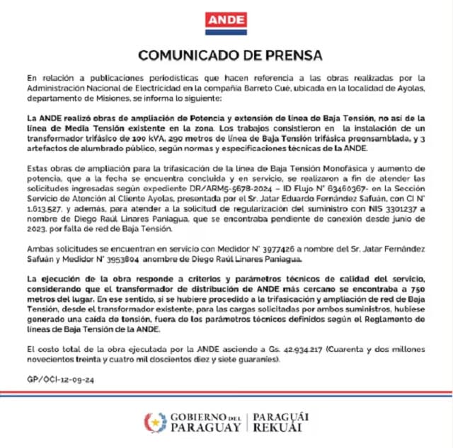 La ANDE defendió que la ejecución de estos trabajos fue necesaria, ya que el transformador más cercano estaba ubicado a 750 metros del lugar. Además, la estatal aclaró que el costo total de la obra ascendió a Gs. 42.934.217.