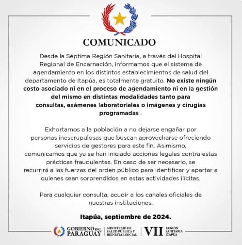 En respuesta a la polémica, la Séptima Región Sanitaria emitió un comunicado aclarando que el agendamiento en los establecimientos de salud de Itapúa no tiene costo alguno. Jorge Ayala, director del Hospital Regional de Encarnación, subrayó que tanto las consultas como los exámenes y cirugías programadas deben ser gestionados sin ningún tipo de pago adicional.
