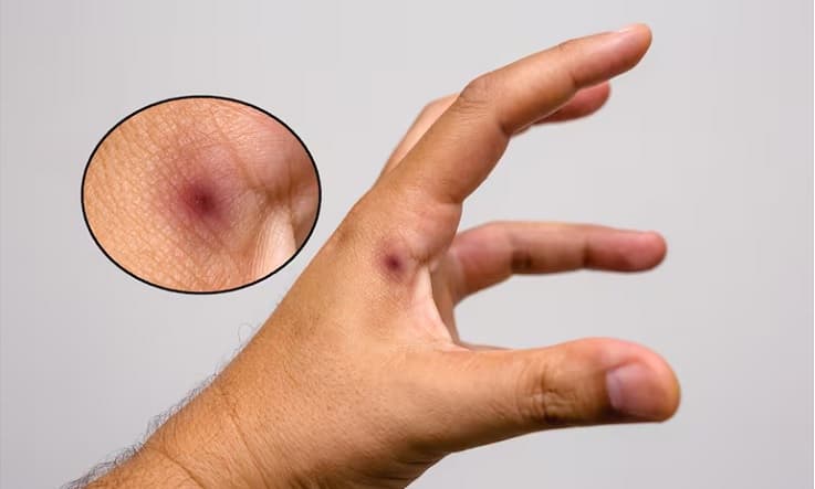 Así luce la picadura de un alacrán en la mano de un hombre.