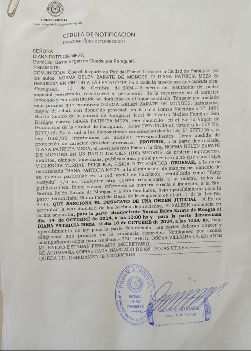 En un preocupante episodio de censura, la mujer identificada como Diana Patricia Meza ha sido objeto de una medida judicial que la obliga a eliminar de su Facebook publicaciones críticas hacia la gobernadora de Paraguarí, Norma Zárate de Monges.
