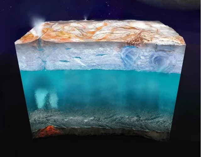 Una concepción artística representa cómo podría lucir la estructura interna de Europa: una capa exterior hecha de hielo de la que podrían brotar columnas de partículas; un océano profundo y global de agua líquida; y un interior rocoso, potencialmente con respiraderos hidrotermales en el fondo marino. NASA/JPL-Caltech