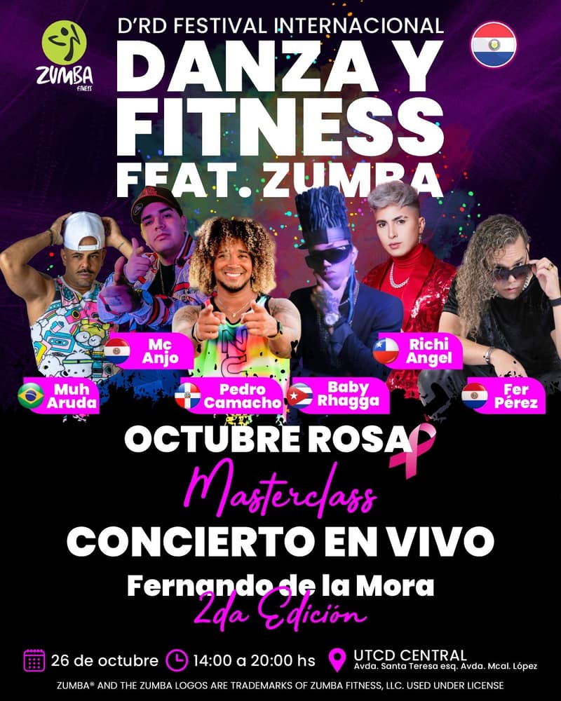 El próximo 26 de octubre, de 14:00 a 20:00, la ciudad de Fernando de la Mora acogerá el D'RD Festival Internacional de Danza y Fitness, un evento que combina actividad física, música en vivo y solidaridad en el marco de la campaña Octubre Rosa. El festival es organizado por el reconocido instructor dominicano Pedro Camacho, y tiene como objetivo promover la prevención del cáncer de mama a través de la concienciación y el bienestar físico.