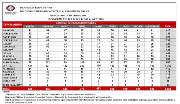 El incumplimiento del deber alimentario por parte de los padres ha sido una problemática creciente en Paraguay en los últimos años. Según datos del Ministerio Público, entre 2018 y septiembre de 2024 se abrieron 48.482 causas por demandas de incumplimiento de la prestación alimentaria, siendo 2023 el año con la mayor cantidad de casos. Solo en lo que va de 2024, ya se han registrado 6.064 nuevas denuncias.