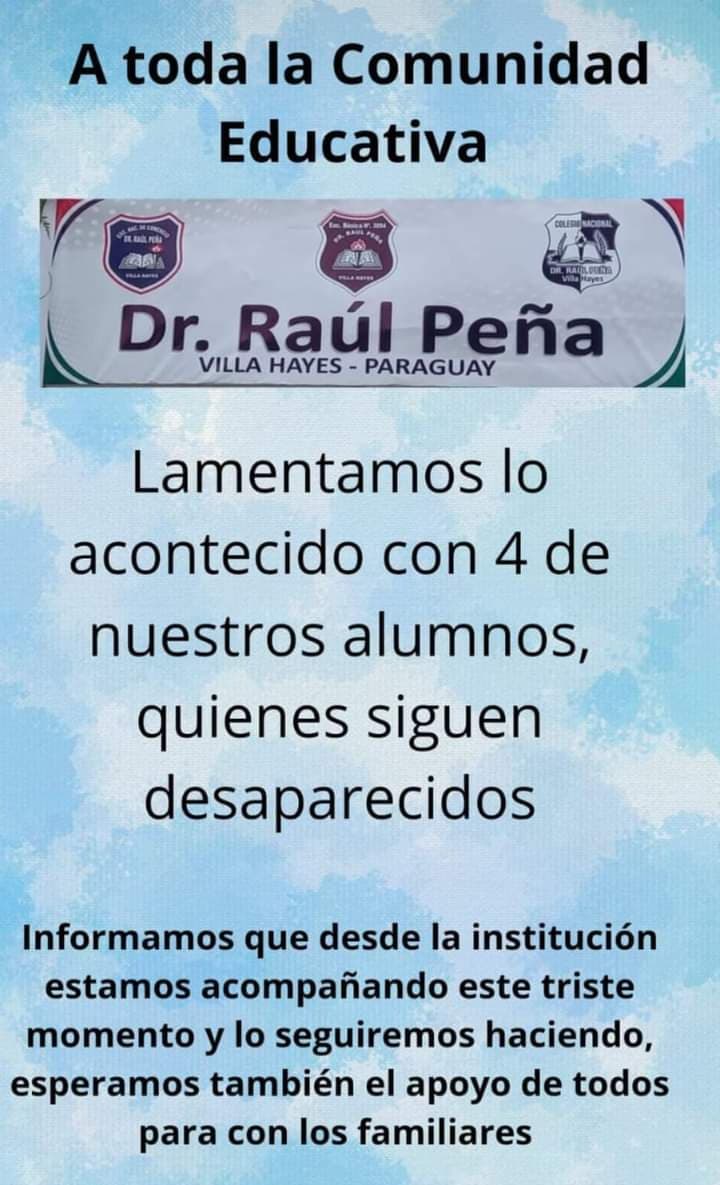 El colegio Doctor Raúl Peña, institución educativa a la que asisten los adolescentes, emitió un comunicado en el que expresó su tristeza y solidaridad ante la desaparición de sus alumnos. La comunidad educativa y los familiares aguardan con esperanza y claman por mayores recursos en las tareas de rescate.