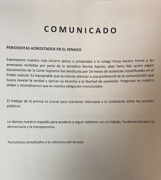 La Bancada Democrática de la Cámara de Senadores emitió un comunicado rechazando las amenazas recibidas por varios periodistas, entre ellos Fiona Aquino, y expresando preocupación por el clima de hostilidad que enfrenta la prensa en el país. En el documento, titulado “La próxima le irá peor”, los legisladores advierten sobre lo que consideran una “deriva autoritaria” promovida desde el poder, que busca generar autocensura y silenciar voces críticas.
