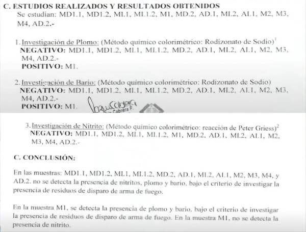 Los exámenes realizados por la Fiscalía incluyeron varias muestras para detectar residuos de disparos en el cuerpo de Gomes. A excepción de una muestra en la zona de la herida en el hemitórax izquierdo, donde se hallaron residuos de plomo y bario correspondientes a la bala recibida, no se encontraron otros rastros de nitrato en las manos ni en el cuerpo de Gomes, descartando así la presencia de residuos de disparos de su parte.