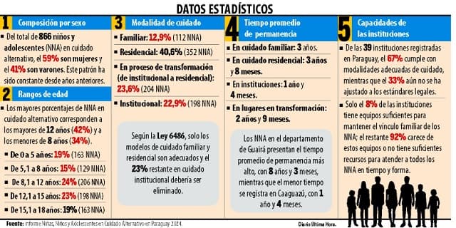 El estudio evaluó las condiciones de 39 instituciones de acogimiento, concluyendo que las limitaciones del sistema dificultan la reintegración familiar y prolongan la estadía de los menores. En promedio, los niños permanecen tres años en estas instituciones, aunque en departamentos como Guairá, el promedio alcanza los ocho años. Esta situación genera un impacto emocional significativo, especialmente en adolescentes, quienes a menudo enfrentan aislamiento y dificultades cognitivas.