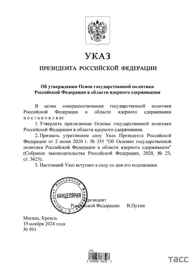 Al cumplirse 1.000 días de la guerra en Ucrania, el presidente de Rusia, Vladimir Putin, firmó un decreto que actualiza la doctrina de disuasión nuclear del país. La nueva política permite el uso de armas nucleares en respuesta a ataques convencionales de gran escala, endureciendo la postura rusa frente a Occidente y a la reciente autorización de Estados Unidos para que Ucrania utilice misiles de largo alcance contra territorio ruso.