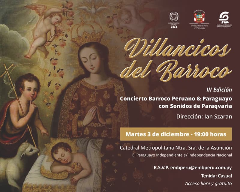 La Catedral Metropolitana de Asunción será el escenario del concierto “Natividad del Señor en el Virreinato del Perú”, organizado por la Embajada del Perú en Paraguay. Este evento, que combina música barroca peruana y paraguaya, se llevará a cabo el martes 3 de diciembre a las 19:00, con entrada libre y gratuita. Estará a cargo del prestigioso conjunto Sonidos de Paraqvaria, bajo la dirección del maestro Ian Szarán.