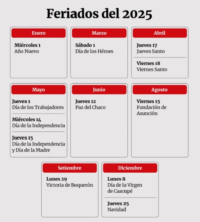 Finalmente, los últimos feriados destacados del año incluyen el Día de la Batalla de Boquerón, el lunes 29 de septiembre, y el Día de la Virgen de Caacupé, celebrado el lunes 8 de diciembre. El calendario cierra con Navidad, el jueves 25 de diciembre, un día clave para el encuentro familiar y las celebraciones religiosas.