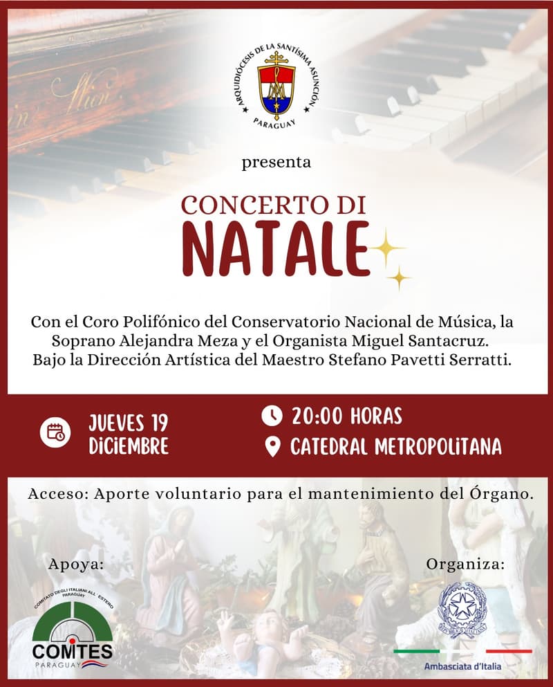 La Embajada de Italia en Paraguay y el Arzobispado de la Santísima Asunción invitan a la edición 2024 del tradicional Concerto Di Natale, un evento que promete cautivar al público con un repertorio sacro, operístico y los villancicos más representativos de Italia y Paraguay. La cita es el próximo jueves 19 de diciembre a las 20:00 horas, en la Catedral Metropolitana de Asunción.