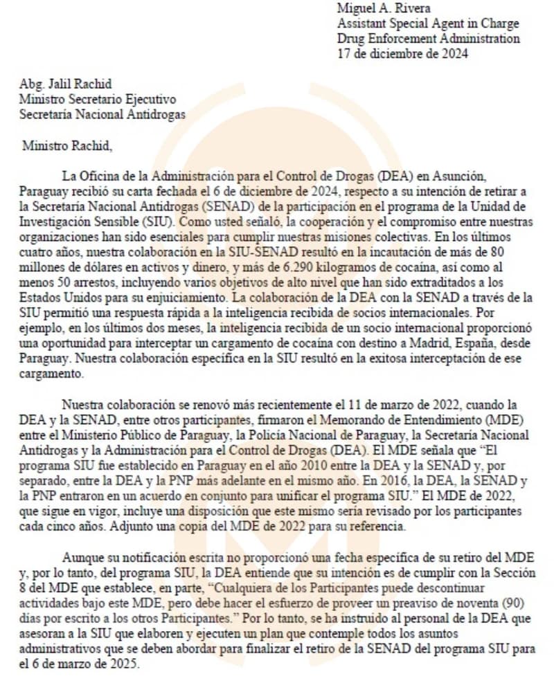 La Administración de Control de Drogas de Estados Unidos (DEA) envió una respuesta oficial a la Secretaría Nacional Antidrogas (Senad) , anunciando el retiro del programa de la Unidad de Inteligencia Sensible (SIU) a partir del 6 de marzo de 2025. Este comunicado, divulgado por medios nacionales, expone la postura tajante de la DEA y ha generado una profunda crisis en el Gobierno paraguayo.