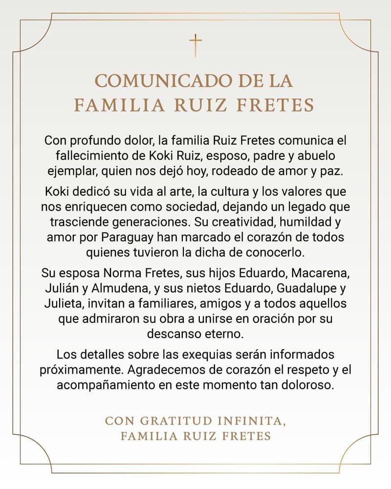 Este viernes, 20 de diciembre, el arte paraguayo amaneció de luto con el fallecimiento de Delfín Roque Ruiz Pérez, conocido como Koki Ruiz, a los 67 años.
