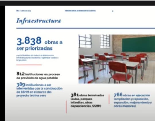 El Ministerio de Educación y Ciencias (MEC) presentó su informe de gestión 2024 con la promesa de renovar 3.838 instituciones educativas para el año 2025. El titular del MEC, Luis Ramírez, destacó una inversión total de G. 100.861 millones durante el año, que incluyó reparaciones en 338 escuelas, dotación de equipamientos en 290 instituciones y mejoras menores en otras 90.