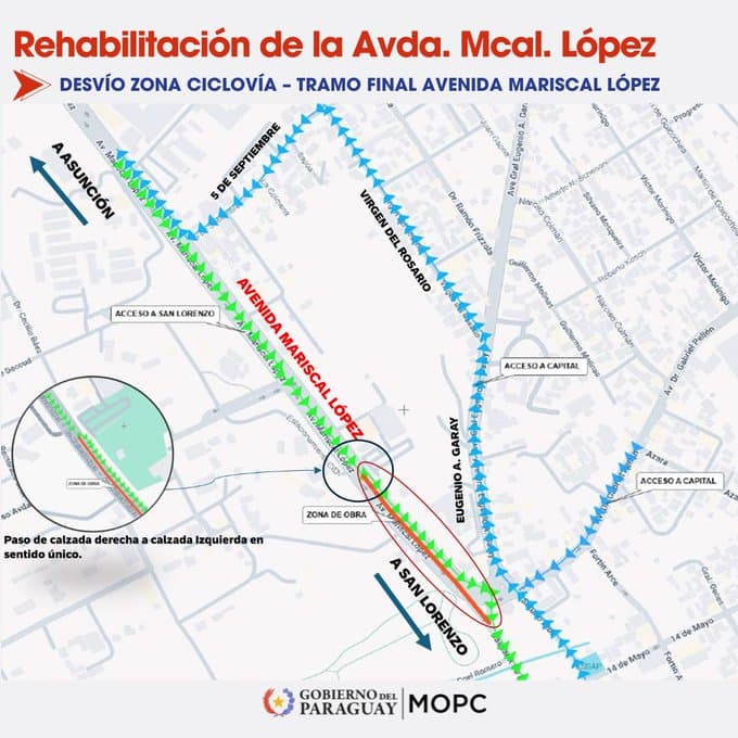 Durante esta etapa, el tramo de salida de Asunción permanecerá cerrado. La calzada contigua será habilitada para la circulación en un único sentido hacia San Lorenzo. Los vehículos que ingresen desde San Lorenzo o Luque deberán utilizar las calles Eugenio A. Garay, Virgen del Rosario y 5 de Septiembre como desvíos para retomar la Avenida Mariscal López. La Patrulla Caminera y la Policía Municipal de Tránsito (PMT) estarán a cargo de guiar a los conductores.