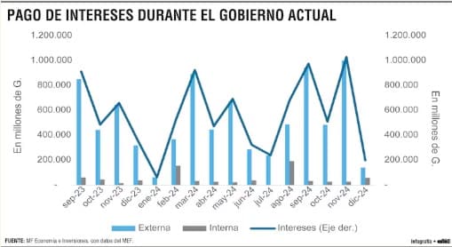 El manejo del endeudamiento público es un elemento central en la gestión fiscal del país. Durante el periodo comprendido entre septiembre de 2023 y diciembre de 2024, el país destinó más de G. 9 billones (aproximadamente USD 1.000 millones) al pago de intereses de su deuda. De este monto, más del 90% corresponde a compromisos externos, lo que evidencia la relevancia del financiamiento internacional en la estructura fiscal.