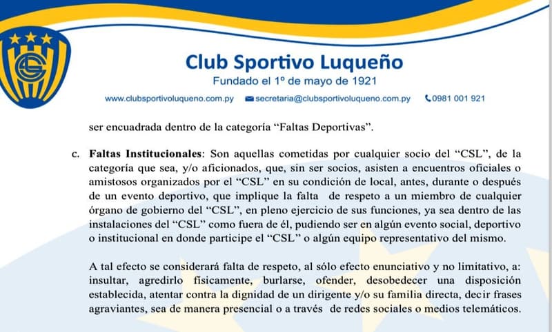 Según el estatuto social, las sanciones aplicarán a actos como insultos, agresiones físicas, burlas y ofensas, tanto presenciales como en redes sociales. Óscar Estigarribia, asesor jurídico del club, explicó que el objetivo es garantizar el respeto mutuo y evitar multas impuestas por organismos como la Conmebol o la Asociación Paraguaya de Fútbol.