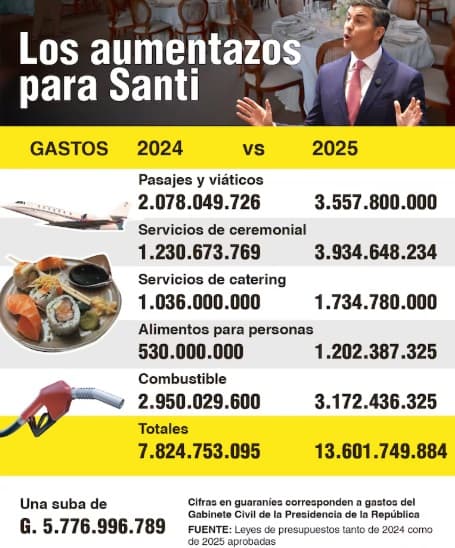 Con estos incrementos, el total destinado a estos cinco rubros asciende a G. 13.601 millones en 2025, frente a los G. 7.824 millones de 2024. Este aumento representa un gasto mensual superior a G. 1.133 millones. Además, no incluye los gastos reservados, que se mantienen en G. 4.000 millones, destinados a actividades discrecionales por razones de seguridad.