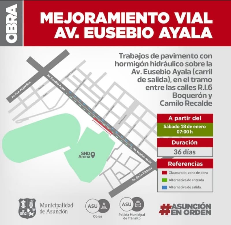 La Municipalidad de Asunción, liderada por el intendente Óscar “Nenecho” Rodríguez, anunció el cierre parcial de la avenida Eusebio Ayala frente a la Secretaría Nacional de Deportes (SND). Las obras de pavimentación con hormigón hidráulico comenzaron el pasado sábado 18 de enero y se extenderán por 36 días, según confirmó la Dirección General de Obras de la comuna.