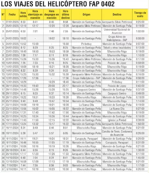 Un total de 37 vuelos fueron registrados entre octubre de 2024 y enero de 2025, conectando la residencia presidencial con la mansión de verano del presidente Santiago Peña en San Bernardino. Los desplazamientos, ejecutados por una aeronave de la Fuerza Aérea Paraguaya (FAP), han sido documentados a través del portal Flightradar24, revelando un uso frecuente del helicóptero estatal.