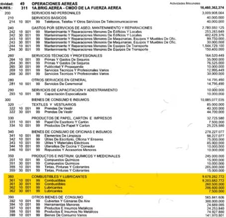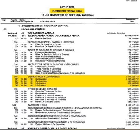 El plan de gastos también incluye un incremento de G. 2.100 millones en el presupuesto de combustible para operaciones aéreas, pasando de G. 7.364 millones en 2024 a G. 9.464 millones en 2025. Dentro del programa TRANSPORTE AÉREO PRESIDENCIAL, se detallan rubros como bonificaciones, asignaciones complementarias, pasajes, viáticos, mantenimiento de equipos y capacitación del personal.