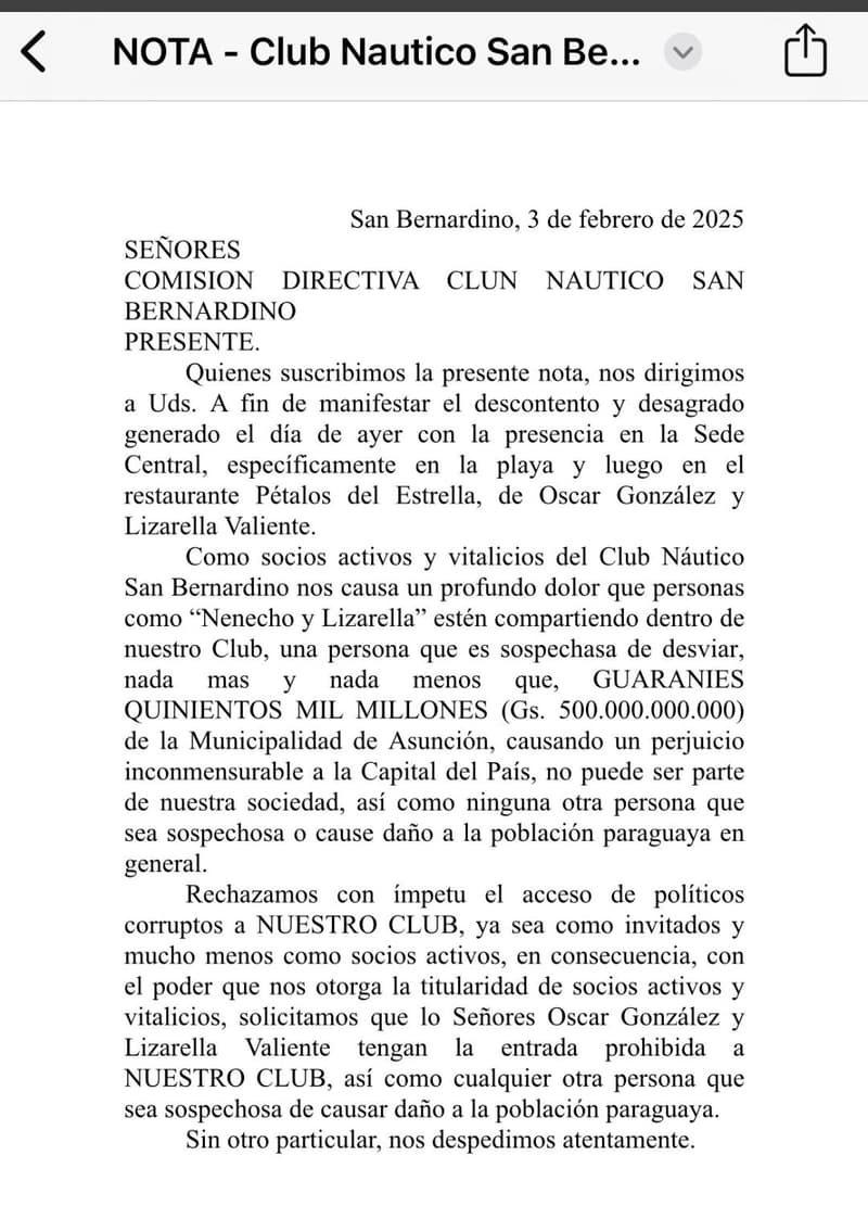 Unite a nuestro canal de WhatsAppComo consecuencia del incidente, un grupo de socios prepara una nota formal de reclamo dirigida a la Comisión Directiva, presidida por Luis Callizo López Moreira. El documento, actualmente en proceso de revisión, busca expresar el repudio ante lo sucedido y prevenir situaciones similares en el futuro. Adicionalmente, los socios solicitarán acceso a las grabaciones de las cámaras de seguridad con audio para verificar la versión oficial de los hechos.
