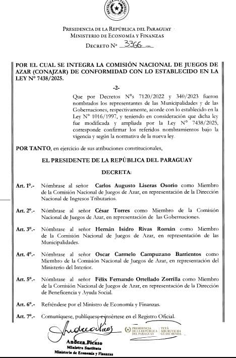 El Poder Ejecutivo formalizó la nueva integración de la Comisión Nacional de Juegos de Azar (Conajzar) mediante el Decreto N° 3366, firmado el 17 de febrero de 2025. Entre los cinco miembros designados destaca la figura de Hernán Isidro Rivas Román, actual intendente de Tomás Romero Pereira, quien representará a las municipalidades en el ente regulador de juegos de azar.