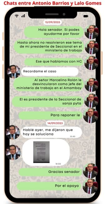 Leé también: Peña elude responder sobre chat de Lalo Gomes y Marco Alcaraz En respuesta a Lalo, Cartes responde lo siguiente: “Veo en la brevedad apreciado Lalo” y “ no te preocupes vamos a solucionar hermano”. A lo que Lalo responde con un “gracias presidente”, evidenciando la jerarquía y el poder de decisión en la estructura política.La gestión para la reposición del funcionario se aceleró cuando Gomes contactó al senador Antonio Barrios el 13 de septiembre. Las comunicaciones muestran cómo Barrios intervino en el asunto, logrando que en menos de 24 horas se emitiera la resolución que restituía a Rolón en su cargo, con una asignación de 8 millones de guaraníes.