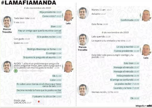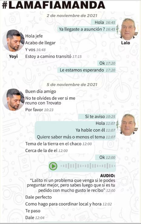 La conversación, fechada el 5 de noviembre de 2021, muestra a Gomes escribiendo a Trovato: “Hay un amigo que quería reunirse con usted. Si le podes recibir”, a lo que el exdirigente deportivo respondió afirmativamente sin cuestionar el motivo del encuentro, señalando en un audio: “...sabes luego que si es tu pedido con mucho gusto le recibo”.