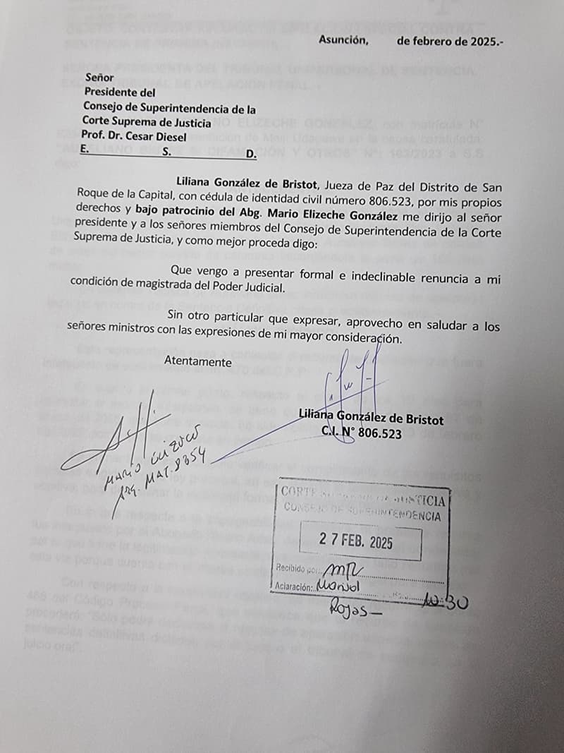 Leé también: Corte suspende a juezas involucradas en la “Mafia de los pagarés”La renuncia fue comunicada a través de una nota presentada por el abogado Mario Elizeche al presidente del Consejo de Superintendencia de la CSJ, César Diesel, donde la magistrada expresó su “formal e indeclinable renuncia” a su condición como integrante del Poder Judicial.