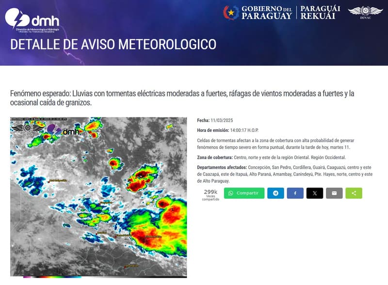 Los departamentos afectados por estas condiciones adversas incluyen: Concepción, San Pedro, Cordillera, Guairá, Caaguazú, el centro y este de Caazapá, el este de Itapúa, Alto Paraná, Amambay, Canindeyú, Presidente Hayes, y el norte, centro y este de Alto Paraguay. En estas zonas se espera el desarrollo de tormentas con actividad eléctrica intensa.