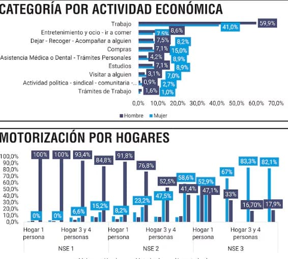 La principal motivación para los desplazamientos es el trabajo, con un 59.9% de hombres y 41% de mujeres movilizándose por esta razón. Existen diferencias significativas en los patrones de movilidad según género: las mujeres se desplazan más que los hombres para realizar compras (15%), asistir a controles médicos (8.9%) y trasladarse a centros educativos (8.9%).