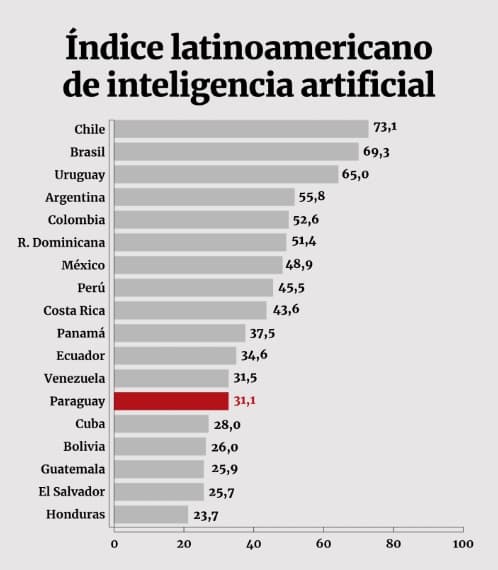 La brecha tecnológica de Paraguay se evidencia claramente al compararlo con los países líderes de la región: Chile encabeza el ranking con 73,1 puntos, seguido de Brasil (69,3), Uruguay (65,0), Argentina (55,8) y Colombia (52,6). Esta diferencia también se refleja en el ranking del FMI sobre preparación para adoptar IA, en el que Paraguay logró apenas una calificación de 0,41 en una escala del 0 al 1, superando únicamente a Guatemala, El Salvador, Bolivia, Honduras, Nicaragua y Venezuela.