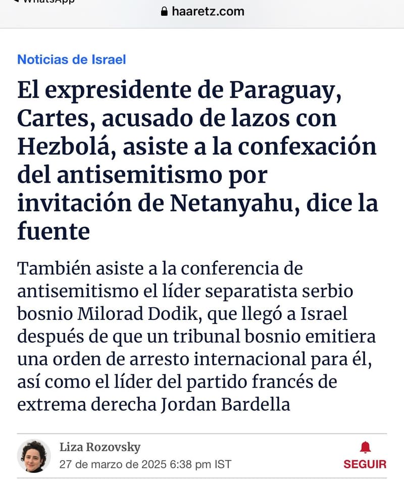 El influyente diario Haaretz encabezó su cobertura señalando que “el expresidente paraguayo Cartes, acusado de vínculos con Hezbolá, asiste a una conferencia sobre antisemitismo por invitación de Netanyahu”. El medio subrayó que la invitación provino directamente de la oficina del primer ministro israelí y que el evento también contó con la presencia de otras figuras polémicas, como el líder separatista serbobosnio Milorad Dodik y el político francés de extrema derecha Jordan Bardella.