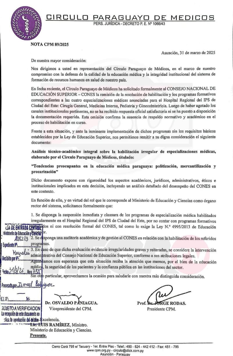 El Círculo Paraguayo de Médicos presentó este lunes un pedido formal al Ministerio de Educación y Ciencias (MEC) solicitando una auditoría académica y de gestión al Consejo Nacional de Educación Superior (Cones). La solicitud responde a la supuesta habilitación irregular de programas de especialización médica en el Hospital Regional del Instituto de Previsión Social (IPS) de Ciudad del Este.