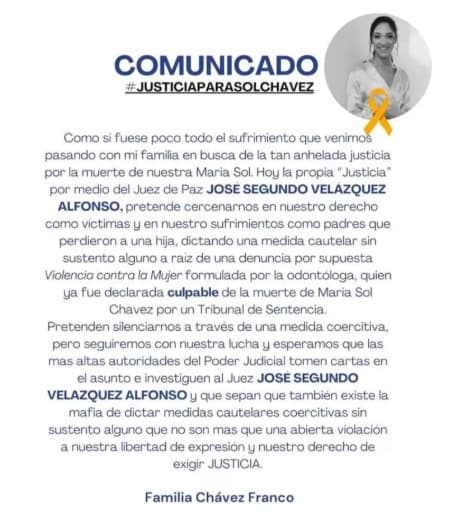 “Como si fuese poco todo el sufrimiento que venimos pasando con mi familia en busca de la tan anhelada justicia por la muerte de nuestra María Sol, hoy la propia 'Justicia', pretende cercenarnos en nuestro derecho como víctimas”, señala el comunicado difundido por la familia Chávez Franco.