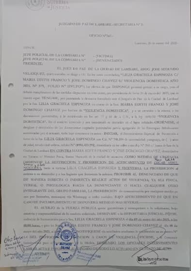 El documento judicial compartido por la familia Chávez Franco revela serias deficiencias en su elaboración. La odontóloga Lilia Graciela Espinoza presentó una denuncia contra los padres de Sol utilizando la Ley 5.777/2016 de violencia contra la mujer, alegando “hostigamiento y violencia” por parte de la familia.