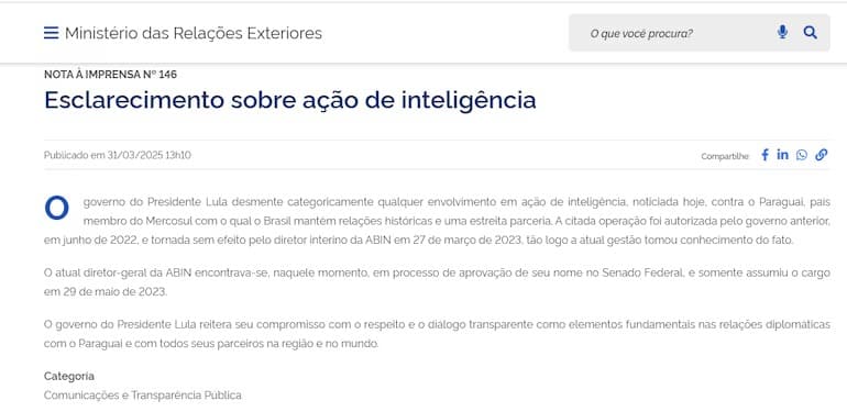 El gobierno del presidente brasileño, Luiz Inácio Lula da Silva, emitió un comunicado oficial en respuesta a las acusaciones de espionaje contra Paraguay, confirmando que efectivamente existió una operación de inteligencia, pero desvinculándose completamente de su autorización. A través del Ministerio de Relaciones Exteriores, las autoridades brasileñas negaron "categóricamente" cualquier participación en estas acciones, atribuyendo la responsabilidad a la administración del expresidente Jair Bolsonaro, quien habría autorizado dicha operación en junio de 2022.